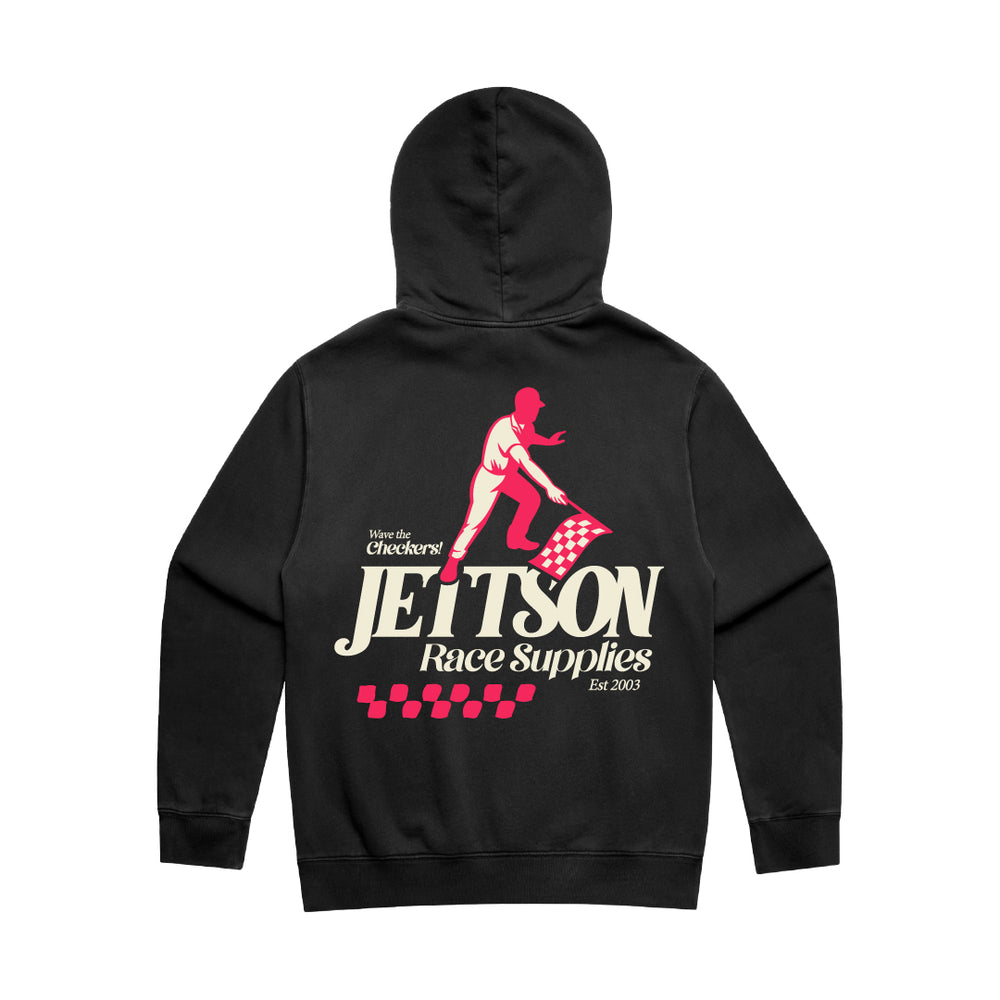 - Faded Black Hood featuring our Race Supplies Collection Design, with a front centre Jettson Chest badge Print and large back print in deep pink and natural hues.